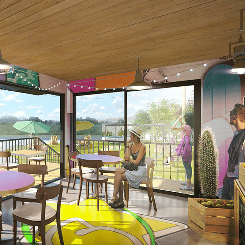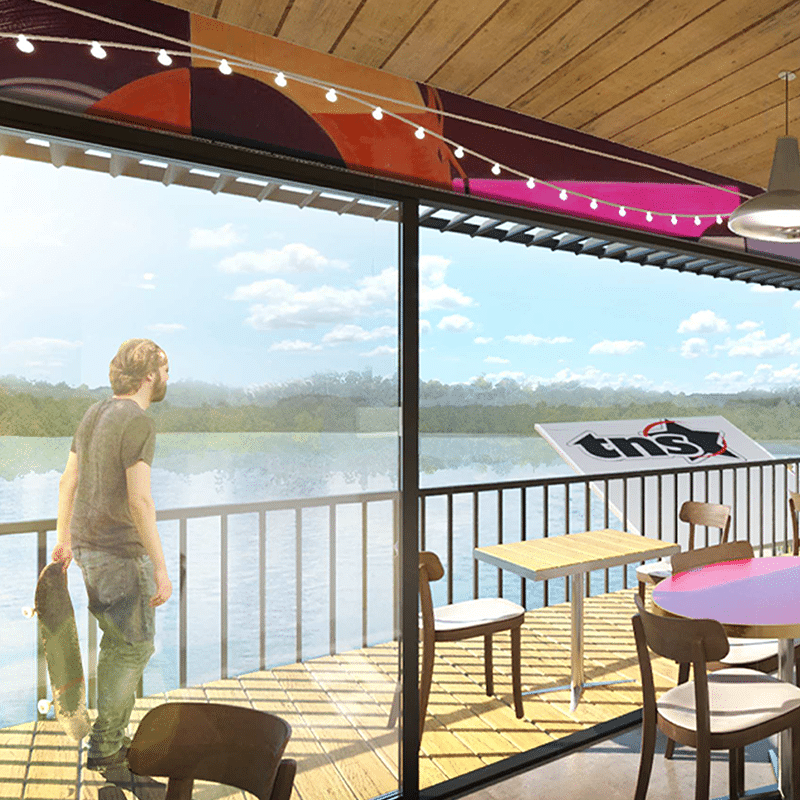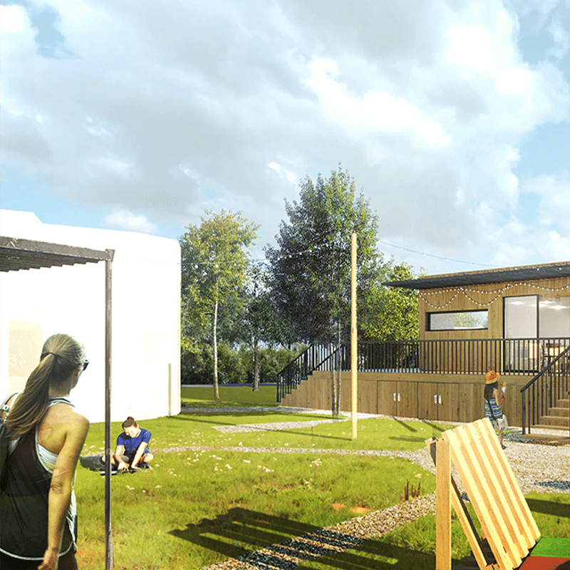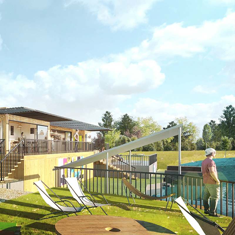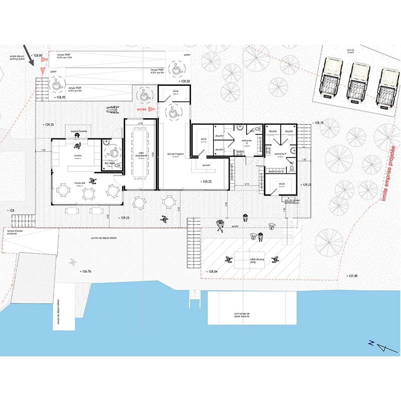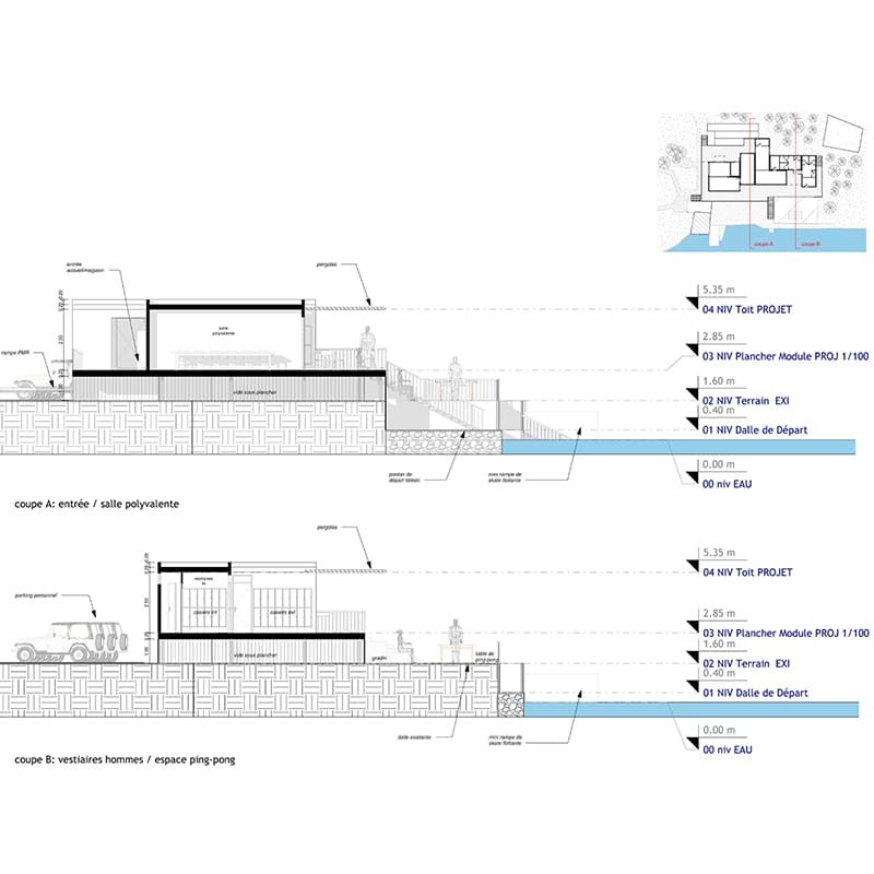 Techniquement, nous proposons la création de fondations en techno pieux. Ce type de fondations nous permet de conserver la dalle béton existante pour y apposer d’autres services. Situé en zone inondable, la surélévation va permettre d’opter pour un vide sanitaire offrant un espace de stocker du mobilier extérieur. Par ailleurs, nous proposons une construction de type modulaire en bois : léger et pratique lors du montage, rapide (temps de chantier). La flexibilité est assuré par les 7 modules, pouvant être modifié à souhait. Enfin, le projet respecte l’environnement par l’origine du bois de son ossature. Ce matériau chaleureux permet de s’intégrer à son environnement par son application en bardage. Afin de minimiser l’emprise constructive, les circulations seront en extérieur. Ces choix permettent, si un jour la ville souhaite récupérer cet espace, de réemployer les installations.
