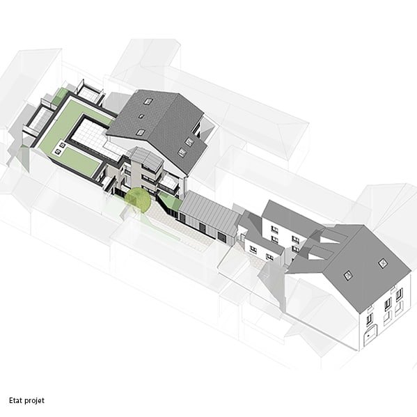 La vieille bâtisse sera rénovée pour accueillir trois appartements dont le dernier sera sous comble. Un nouveau bâtiment qui abritera trois autres logements se greffera à celui existant, partageant ainsi une partie commune comprenant les escaliers. Ce nouveau bâtiment sera couronné d’une toiture plate végétalisée non accessible.