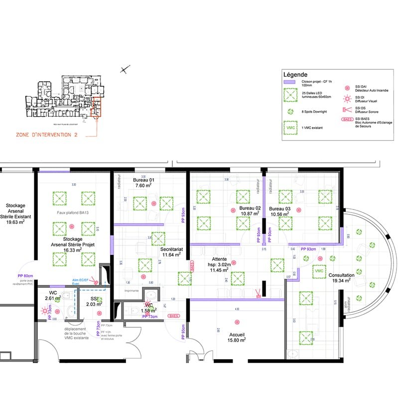 Lors de la première phase, nous avons proposé le ré agencement d’une salle de réunion en RDC bas et de la création d’un service de consultations CHIR mains au RDC Haut.