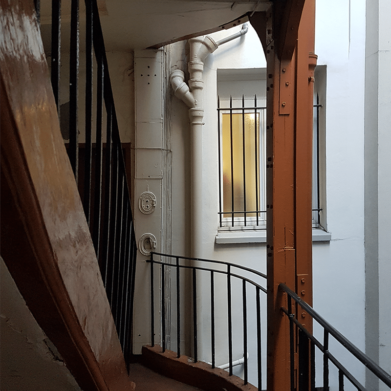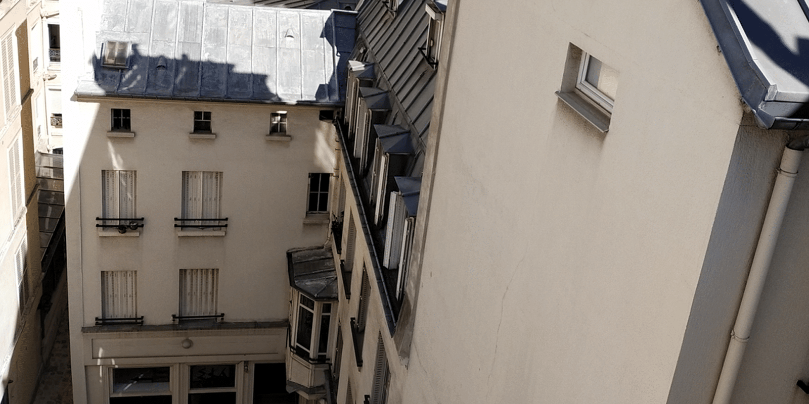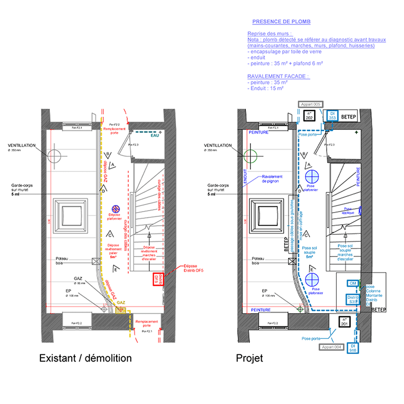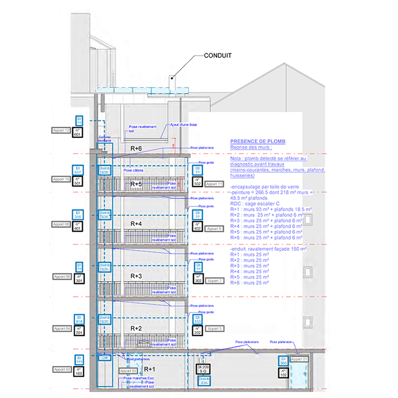 Ce projet de rénovation de deux immeubles parisiens concerne les parties communes des logements (dont le porche d’entrée, la cour et les deux espaces de distribution), les toitures en Zinc et les façades sur cour. Une première phase a été réalisé avec la réfection des toitures en Zinc il y a quelques mois. Prochainement, il y aura une étape de déplombage et de désamiantage puis les réseaux existants (gaz, électrique) seront curés. Un ravalement des façades et la création d’une verrière dans une coursive couverte ouverte assurera la pérennité de l’ouvrage.