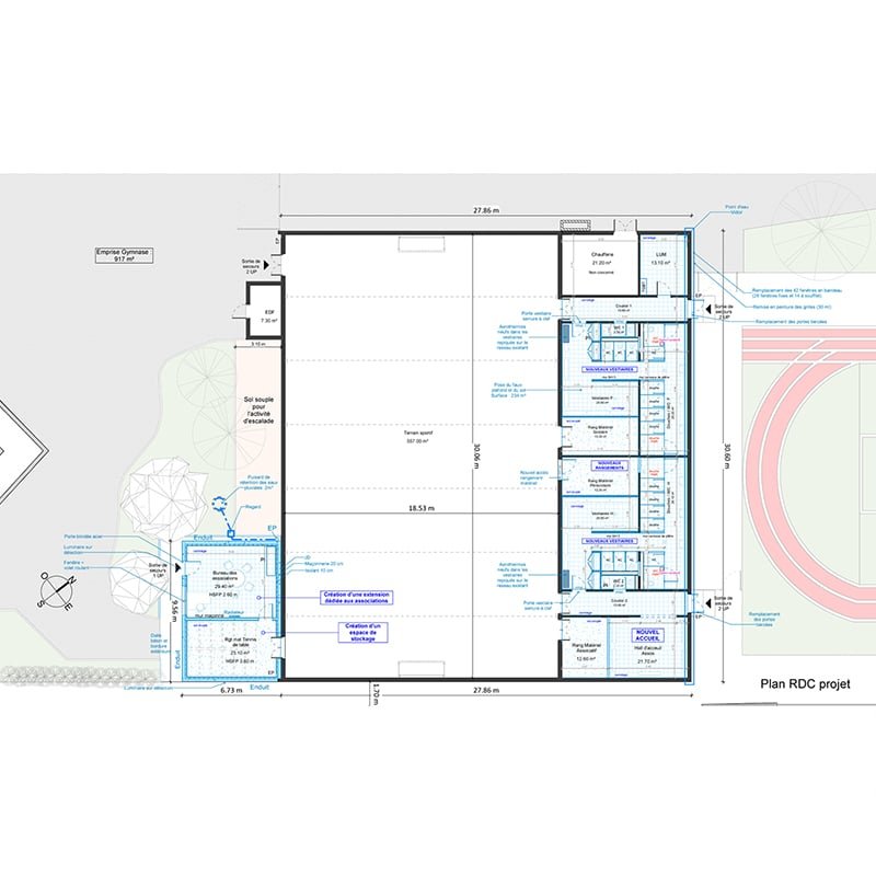 Ce projet vise à rénover un gymnase existant tout eny ajoutant une extension dédiée aux associations sportives à l’arrière du bâtiment.
