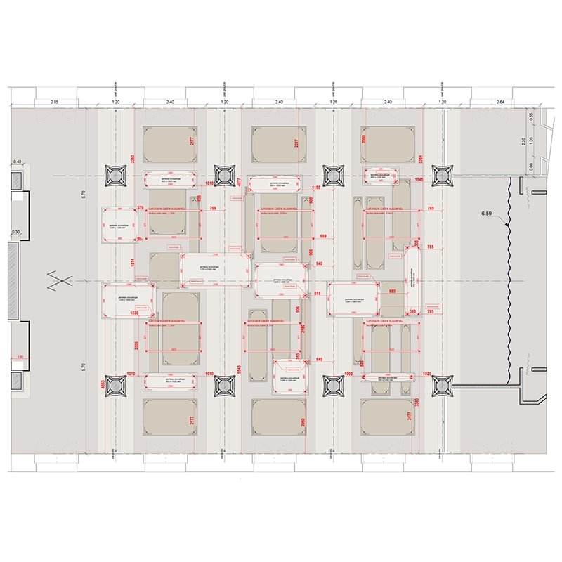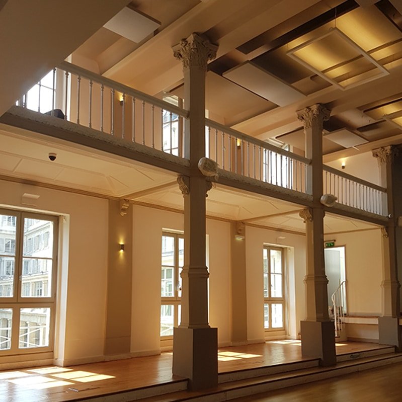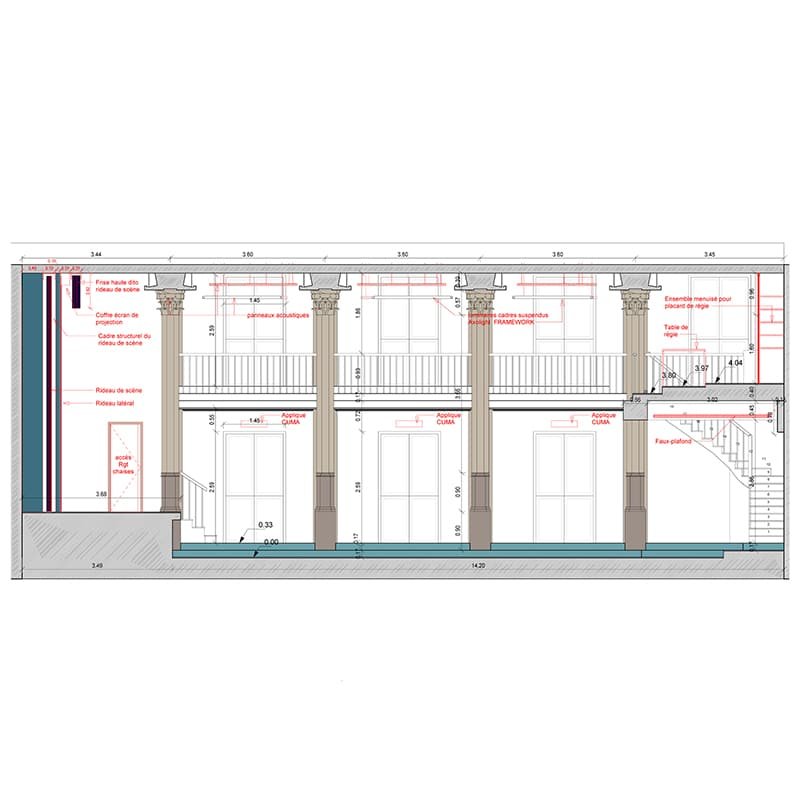L’Institut est un très beau bâtiment de la fin du 18ème siècle, dont certaines parties sont classées et/ou inscrites aux Monuments historiques. Les choix techniques et artistiques pour la modernisation générale des espaces concernent entre autres, la restructuration de la salle polyvalente. Ils ont été réalisés avec modération pour ne pas dénaturer le lieu. La première étape de notre mission a été la prise en compte des caractéristiques architecturales de la salle : double hauteur sous plafond, colonnes avec chapiteaux de style corinthien, coursives courant tout le long de la salle. – Côté technique, la sonorisation a été repensée par la mise en place de panneaux acoustiques au plafond, enchevêtrés de manière asymétrique pour apporter un certain dynamisme. Par une mise en couleur discrète et subtile, ils modernisent l’espace tout en gardant l’esprit du lieu. – Côté artistique, une réflexion sur la sélection et la disposition de nouvelles teintes dans cet espace a été engagée en amont du travail de réhabilitation. Il faut mettre en valeur le lieu en le laissant respirer. Le point de départ du travail de mise en couleur a été l’œuvre de Gonzagues Privat -“L’abbé de l’Epée instruisant ses élèves en présence de Louis XVI”-, datant de 1875, qui trône sur la scène ; c’est également un élément constitutif de cette pièce puisqu’il est mis en valeur et bien visible depuis l’entrée. Nous sommes donc partis de ce tableau pour choisir les coloris de l’espace scénique, et en avons extrait une nuance. Cela amène une jolie harmonie à la salle. Depuis 2016, l’Atelier MAD a commencé une collaboration sur le long terme avec l’INJS. Nous entreprenons tous les ans depuis, une campagne de travaux (réaménagement et rénovation des espaces intérieurs dans un souci de cohérence avec les particularités patrimoniales, Sécurité Incendie, accessibilité PMR…) afin de veiller à améliorer le cadre de vie des usagers.