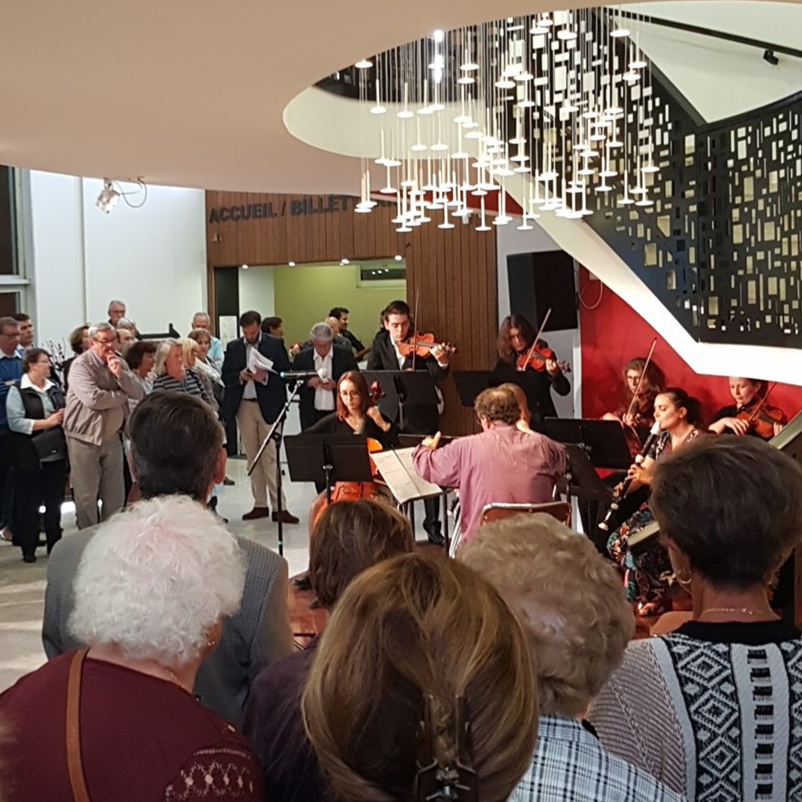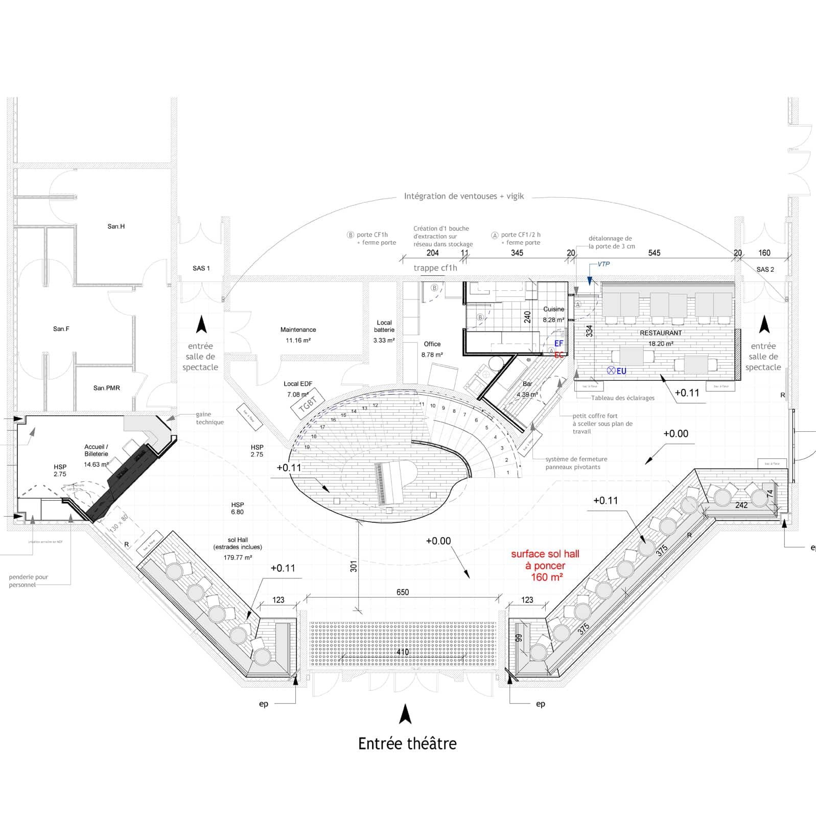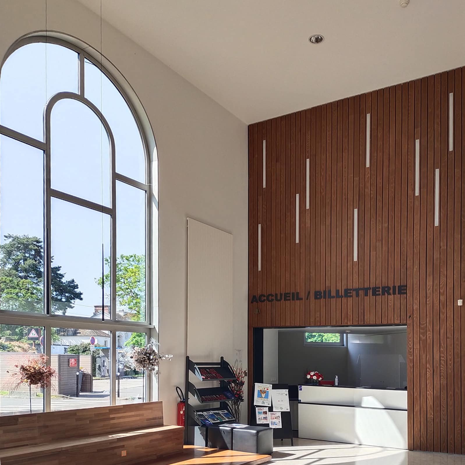 La rénovation de l’ensemble du Foyer/Hall du théâtre Donald Cardwell a été mené à partir du ré-agencement des services proposés (accueil-billetterie / bar-cuisine). L’idée première était de créer un espace ouvert et convivial, générateur de lien social, adapté aux déplacements des usagers pour un BEFORE et/ou un AFTER de la représentation. Le parti-pris a été de conserver les symboliques du théâtre en créant une estrade en face de l’entrée, telle une petite scène ouverte accueillant le public dès son arrivé.